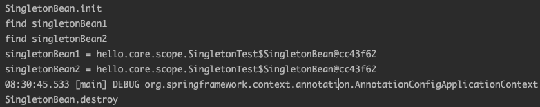 빈 초기화 메소드를 실행하고, 같은 인스턴스의 빈을 조회하고, 종료 메소드까지 정상적으로 호출되었다.